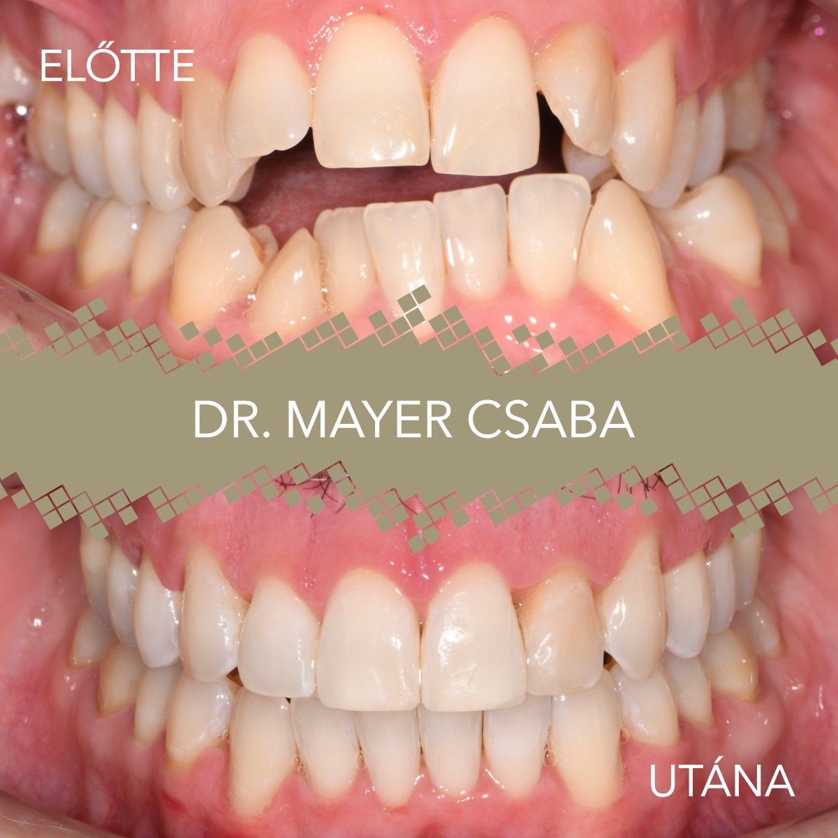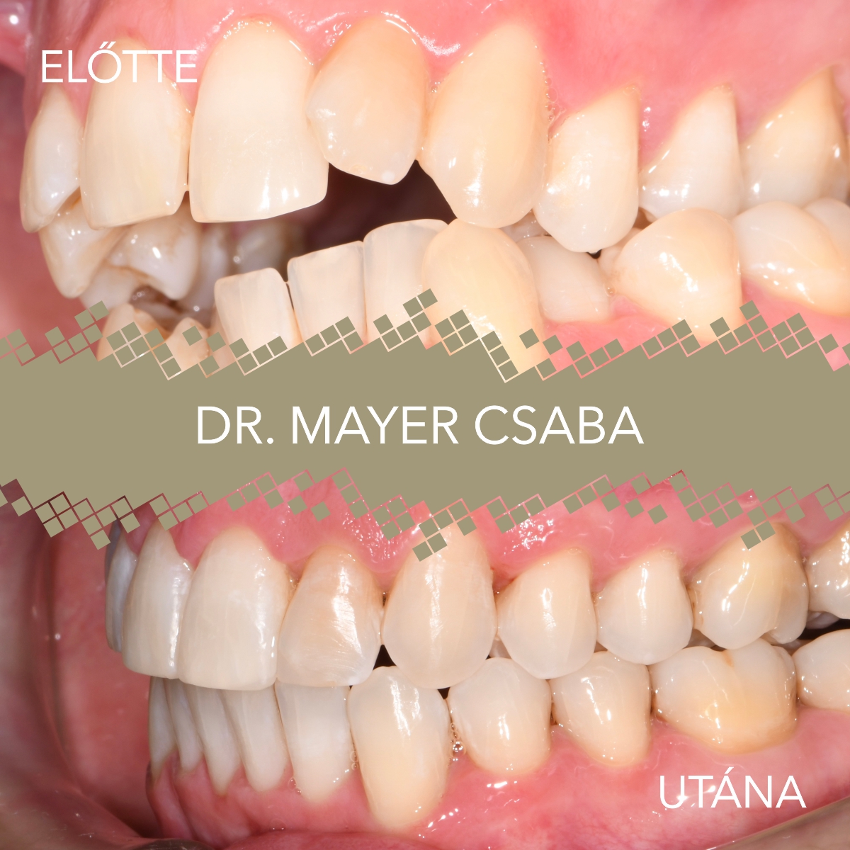 Hiszen ennél a páciensnél is látszik mekkora távolság van az alsó és a felső fogív között. Ha oldalról megnézzük látszik hogy a felső fogív szűkebben áll, mint az alsó, ezt keresztharapásnak hívjuk, mind a két oldalon. Az alsó fogívben hatalmas torlódás látható, látszik hogy az alsó szemfog 90 fokban van elfordulva, és amikor összezárja a páciens hátul a fogait akkor elől nem érnek össze, ezt nyitott harapásnak nevezzük.